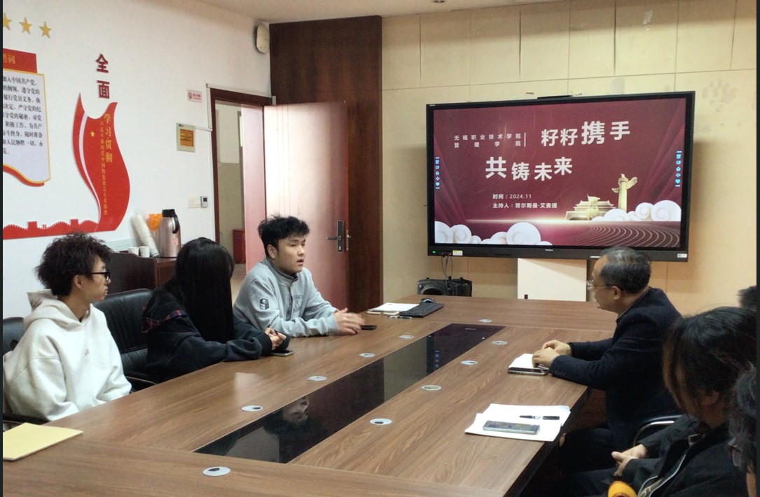 会议伊始,交流环节拉开了序幕。努尔斯曼首先代表管理学院向远道而来、在无锡职业技术学院就读的2024级少数民族新生表示了热烈的欢迎。她表示,管理学院一直致力于打造一个多元、包容、和谐的学习环境,希望同学们能够在这里收获知识、友谊和成长。随后,来自五湖四海的2024级新生依次进行了自我介绍。他们满怀热情地介绍了自己的家乡、习俗文化和所代表的民族。从辽阔的草原到巍峨的山脉,从丰富的美食到独特的节日庆典,同学们的介绍让在场的每一个人都感受到了中华民族文化的多样性和博大精深。