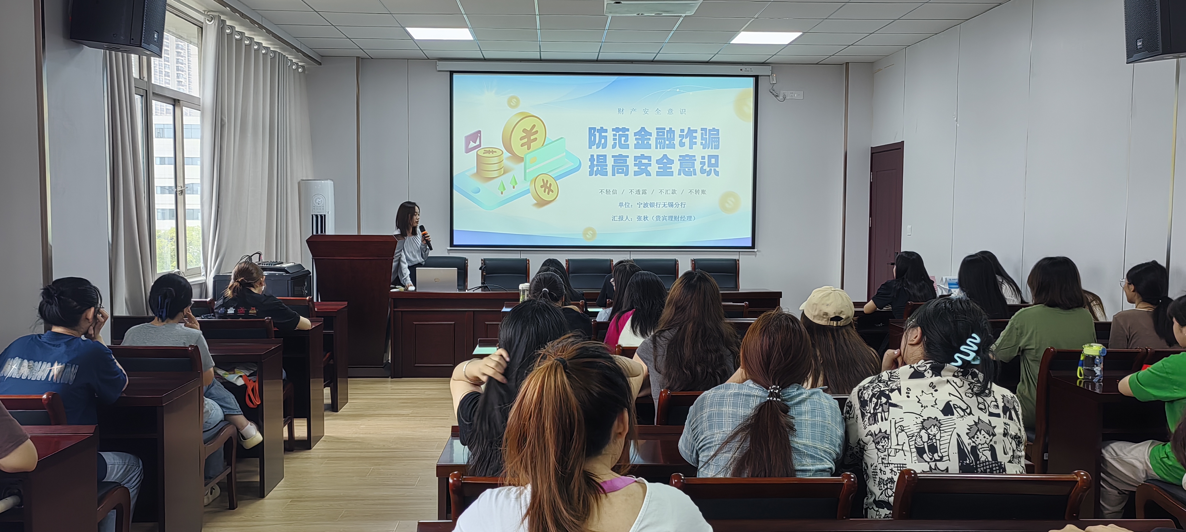 本次知识宣讲会特邀请宁波银行张秋经理主讲。她首先通过向同学们提问“什么是金融机构”来引出金融机构介绍。张经理从使用银行卡的注意事项、用卡安全及账号密码安全等方面做了全面的讲解。接着,张经理详细介绍金融诈骗的常见手段,提醒同学们注意游戏币诈骗、网络交友诱导投资、虚假中奖诈骗、虚假购物及消费短信诈骗等,告诫大家不要轻信来历不明的电话,不向对方透露自己及家人的身份信息、银行卡等,不向陌生人汇款、转账。