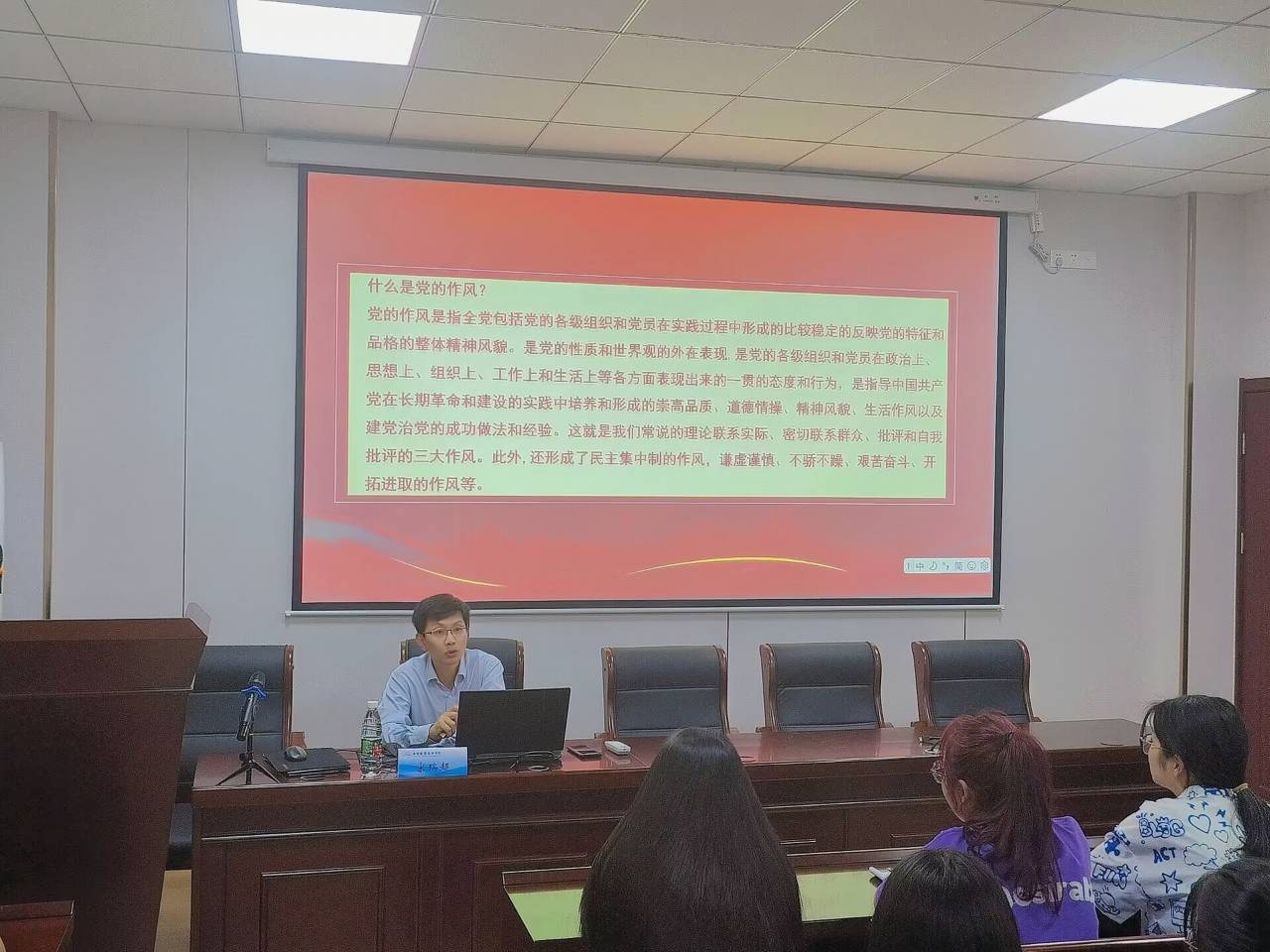 宋书记首先为大家介绍了党的作风的内涵与特点,党的作风是党的无产阶级性质和世界观在党的工作与活动中的表现,是全党包括党的各级组织和党员个人在政治、思想、组织、工作、生活等方面体现党性原则的一贯的态度和行为。在了解完党风的含义后,宋书记指出,在党发展的百年历史长河中,党也形成了理论联系实际、密切联系群众、批评与自我批评的优良作风,这是党长期坚持并要不断发展的优良传统。最后,党的作风建设是关系党的生死存亡的大事,加强党风廉政建设,有利于保持党的先进性和纯洁性,有利于规范党员言行,有利于凝聚党心、振奋民心。