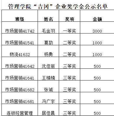 经过综合评定,2018年吉冈企业奖学金(管理学院)拟按照下表进行分配,现予以公示: