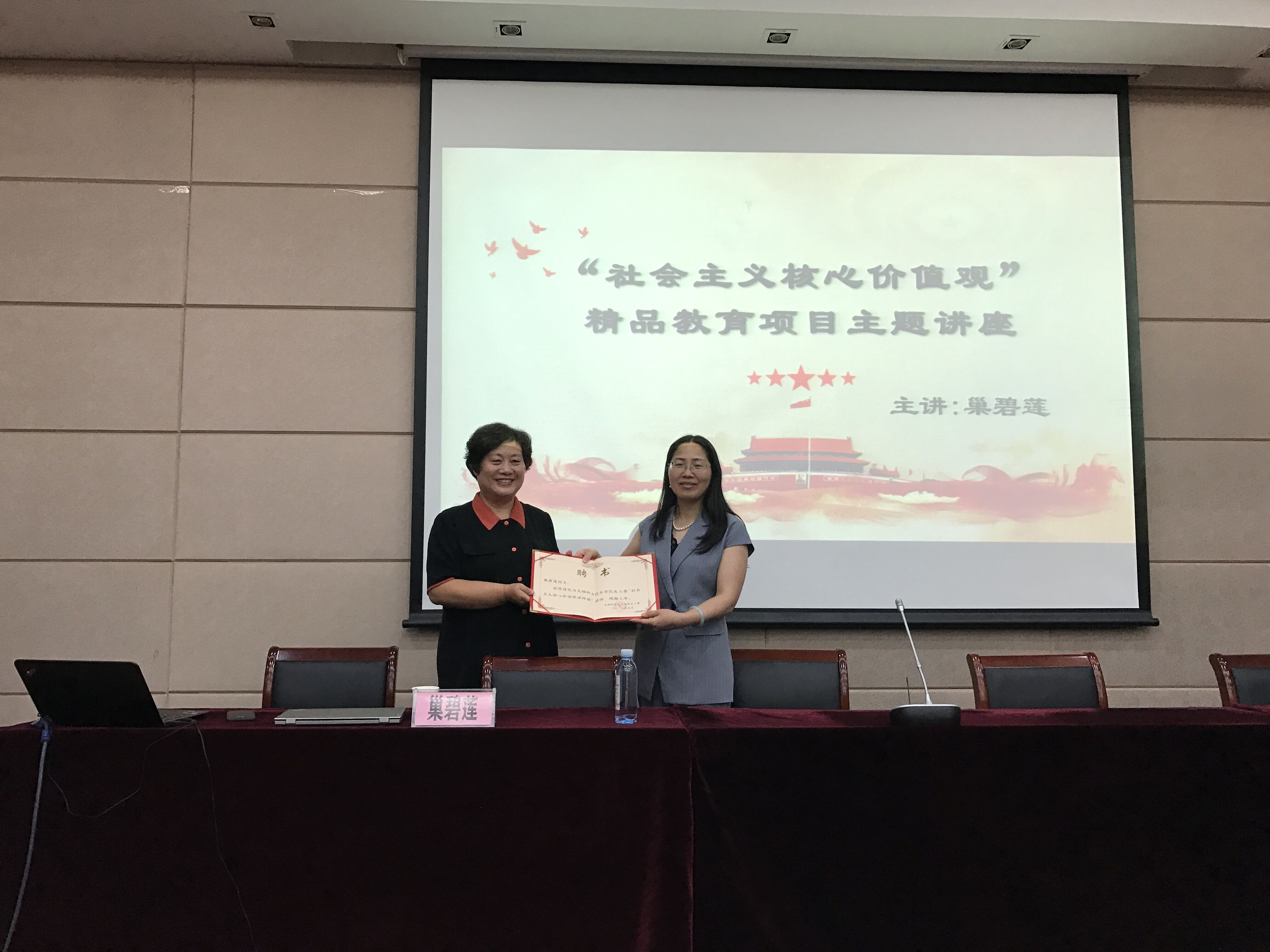讲座结束后,杨雪琴副校长代表学校为巢碧莲教授颁发了关工委讲师团讲师聘书。同时也希望为更多专家搭建交流座谈平台,协同助力我校关工委优质化建设工作和大学生思想政治工作。(撰稿、摄影:刘世强;审核:苗勇)