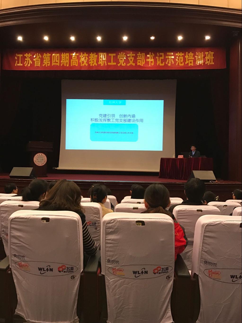 11月15日至18日,我校管理学院第二党支部书记朱倩参加了由省委教育工委主办苏州大学承办的“江苏省第四期高校教职工党支部书记示范培训班”。培训班紧紧围绕学习贯彻党的十八届六中全会精神和习近平总书记一系列重要讲话精神,切实推进教职工党支部标准化建设、切实提高基层教职工支部书记素质、能力为主线展开。为期4天的培训,内容充实、节奏紧凑、形式多样,采用专家讲座、现场学习、专题讨论等方式进行,来自全省100多所高校165名教职工党支部书记参加了此次培训。