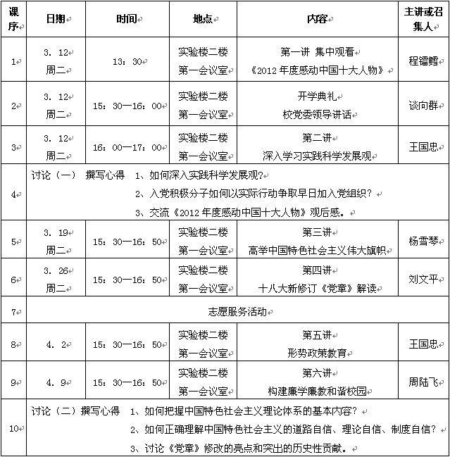 2012-2013学年第2学期入党积极分子培训班课程安排(中桥校区)