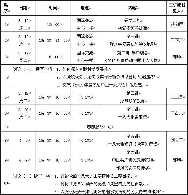 2012-2013学年第2学期入党积极分子培训班课程安排(太湖校区1班)