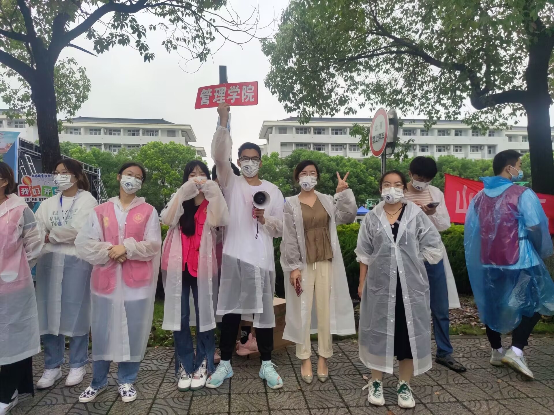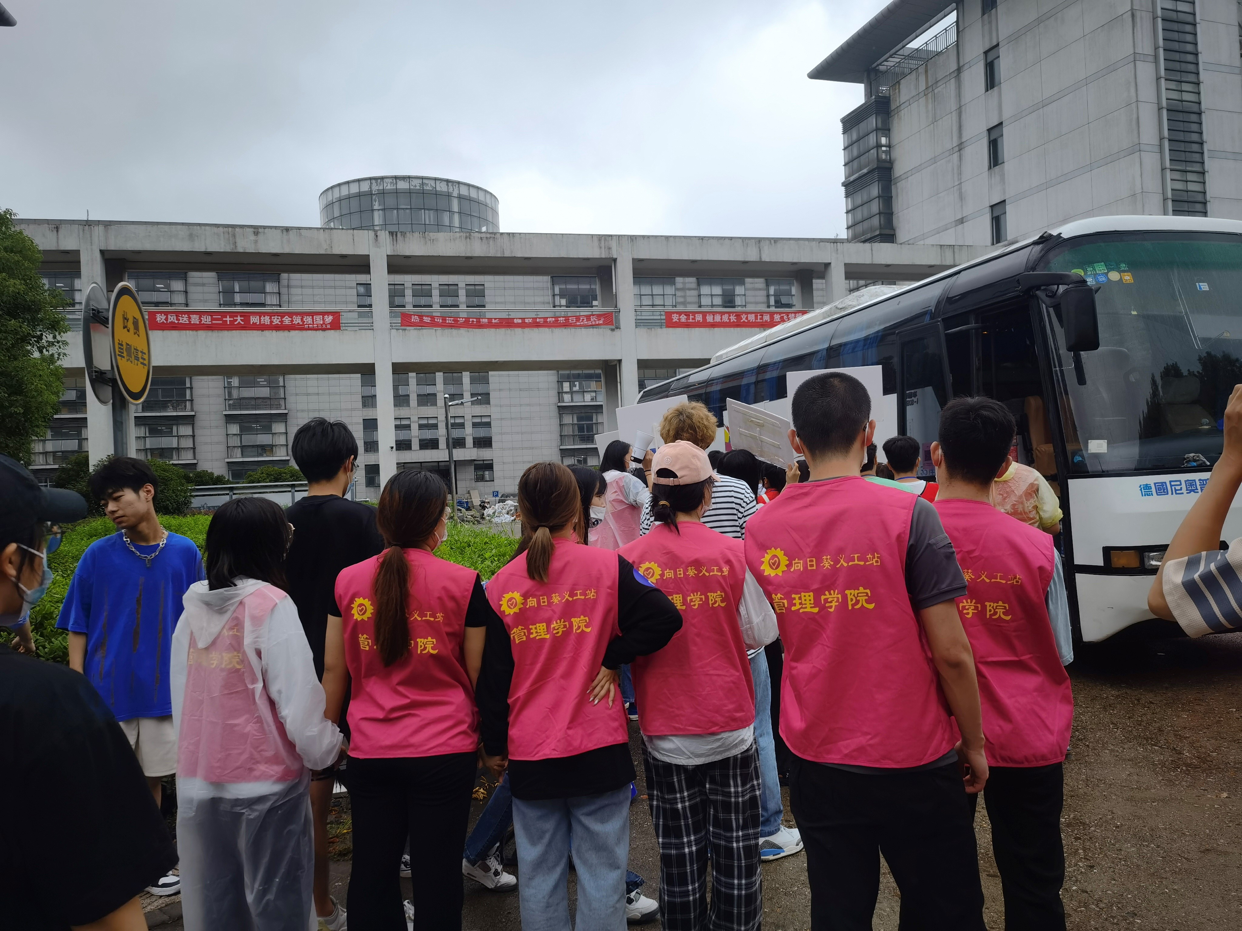 由于疫情防控常态化工作需要,今年新生入学需佩戴口罩,在校门口通过体温检测,并查验行程码、苏康码和返校码,无异常者方可进入校园。同时,管理学院的志愿者举着引导牌和老师在路边最显眼的位置等待着新生的到达。