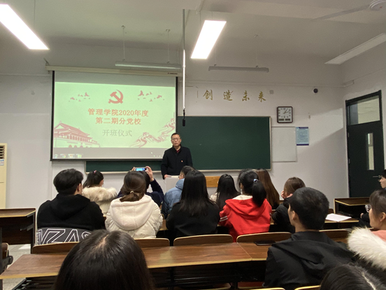 12月8日下午13:00在J3-202举行了管理学院2020学年度第二期入党积极分子培训班分党校开班典礼。管理学院党总支书记苗勇老师,学生党支部书记朱琳老师,分团委书记刘世强老师、辅导员程镭鳕、刘婷婷、晁帅老师和学生代表共76人一起参加本次分党校开班典礼。
