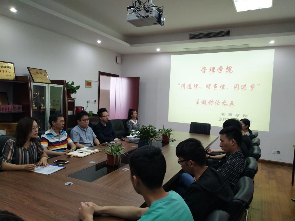5月18日上午,管理学院“讲道理、明事理、同进步”道理课堂第五讲在明德楼A-415会议室开讲。出席本次道理课堂的有管理学院冯臻副院长、翁爱祥副院长、管理学院辅导员及市场市场营销41641全体同学。