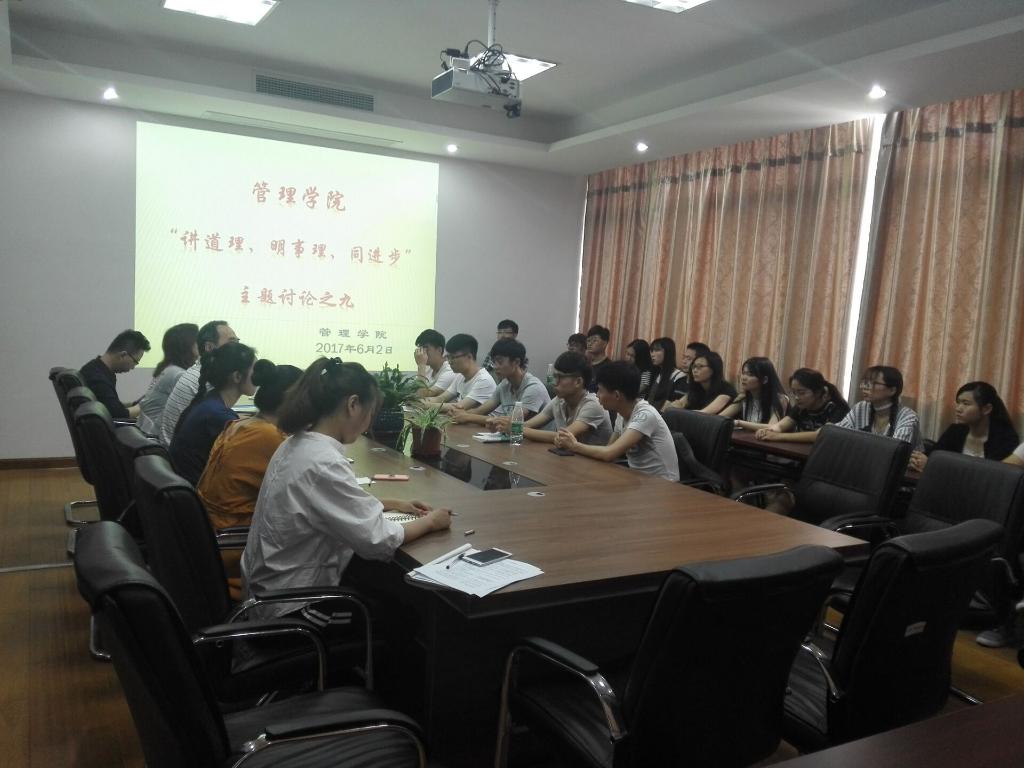 2017年6月2日上午,管理学院在明德楼A-415会议室开展了管理学院“讲道理、明事理、同进步”道理讲堂系列的第九次讨论。分院党总支书记江铭、辅导员朱倩、徐进、程镭鳕、市场营销本科班大二、大三、大四年级的优秀学生代表及2016级营销41642班全体同学参加了本次道理讲堂。