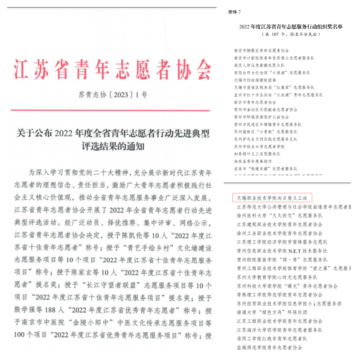 日前,共青团江苏省委、江苏省青年志愿者协会公布了2022年度全省青年志愿者行动先进典型评选结果,无锡职业技术学院管理学院向日葵义工站荣获2022年度江苏省青年志愿服务行动组织奖。