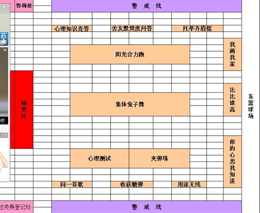 活动规则:3个以上的宿舍同学参赛,用红绸带捆绑两个参赛选手在踝关节以下部位,所有参赛成员统一站在起跑线后,听裁判哨声后,同时跑出去,用时一分钟以内就过关,过关即可得过关券一张。