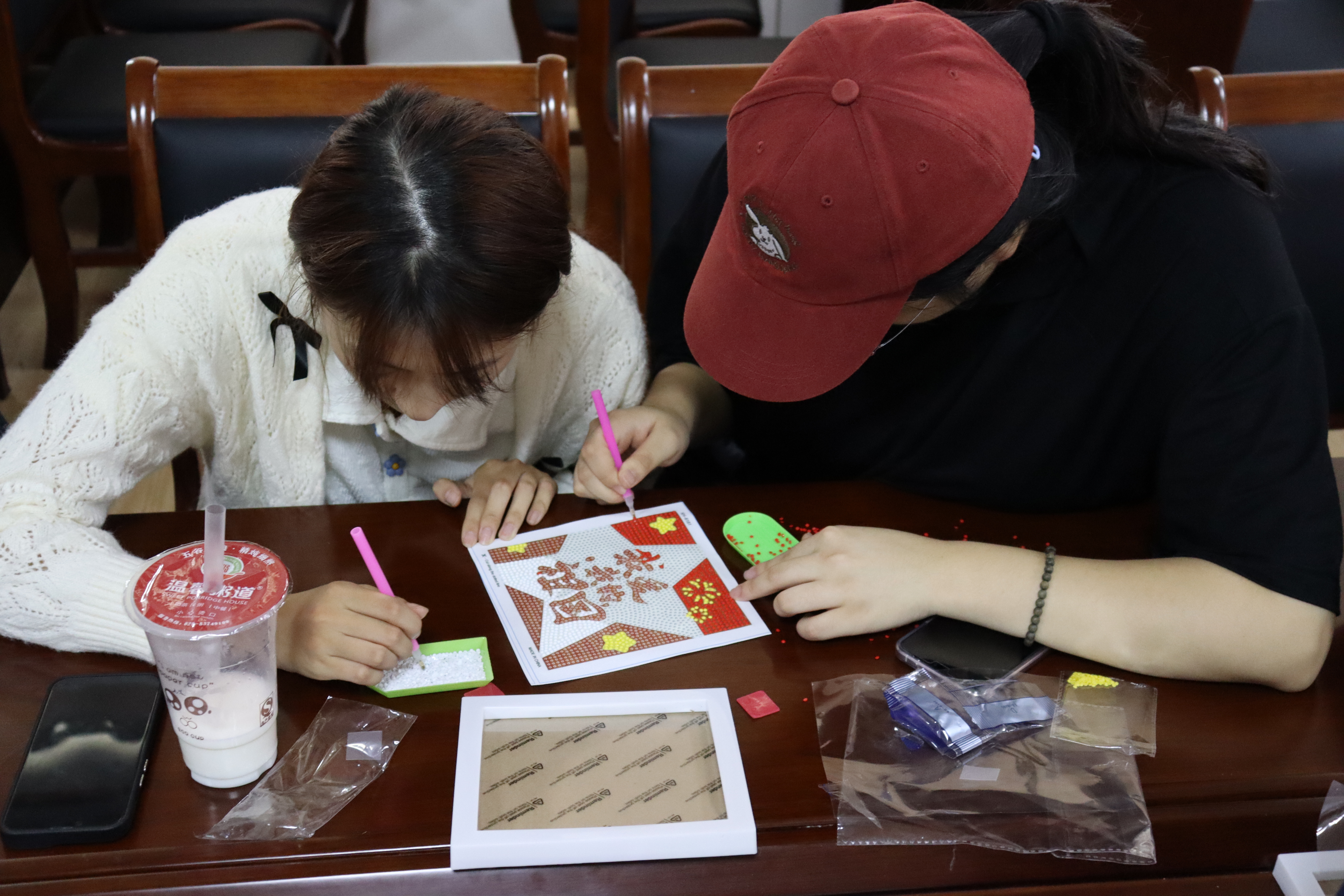 活动在一片欢声笑语中开始,王煜老师首先发放了手工材料,随后娓娓道来地讲解了钻石画制作的基本技巧和方法。他一边演示一边鼓励同学们大胆发挥想象力和动手能力。同学们在王老师的指导下迅速上手,将五颜六色的钻石放入小托盘,用点钻笔巧妙地取胶泥,细心地按照图纸将钻石点入相应的位置。每一个步骤,都伴随着专注与热情,每一笔每一画,都是对祖国深情的表达。