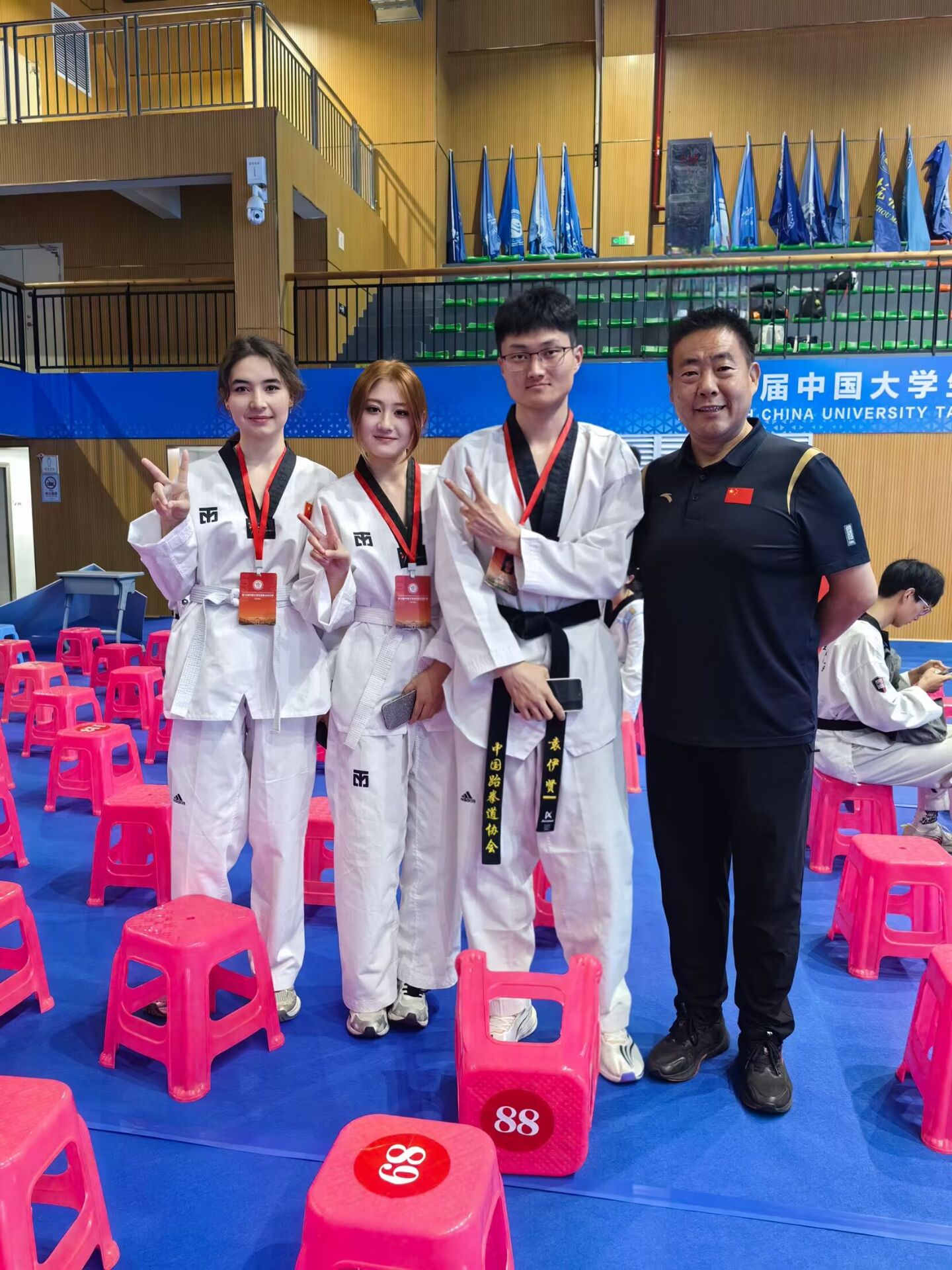 无锡职业技术学院由王坤、朱杰两位教练带队。经过激烈的比赛,我校秉持着“礼义廉耻、忍耐克己、百折不屈”的跆拳道精神,坚持不懈地与对手对战,最终,我校取得优越的成绩,其中,管理学院电子商务22321班的热伊莱·吐尔孙荣获女子乙组67公斤级铜牌,电子商务22322班的杨璐瑜荣获女子竞技团体第六名。