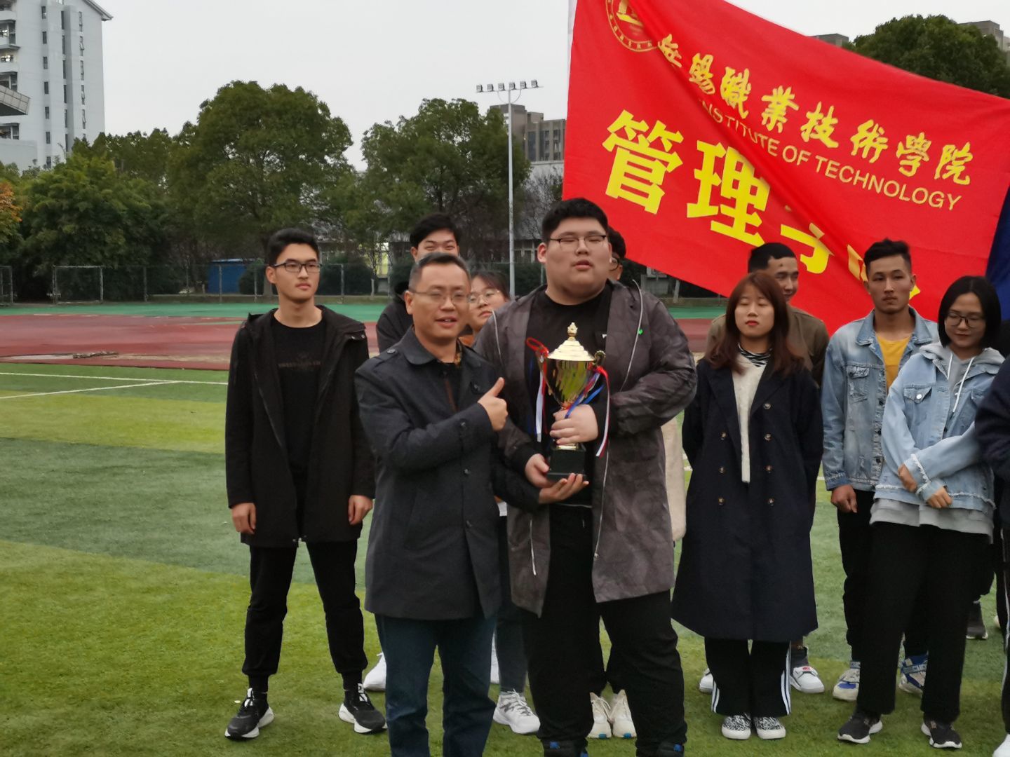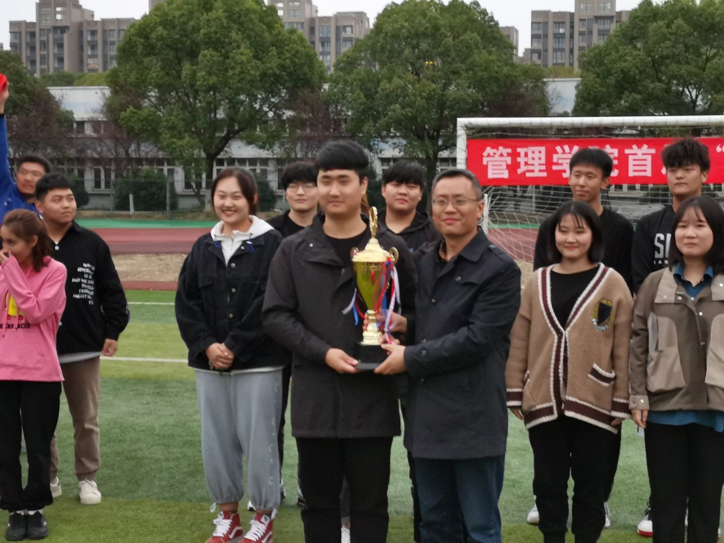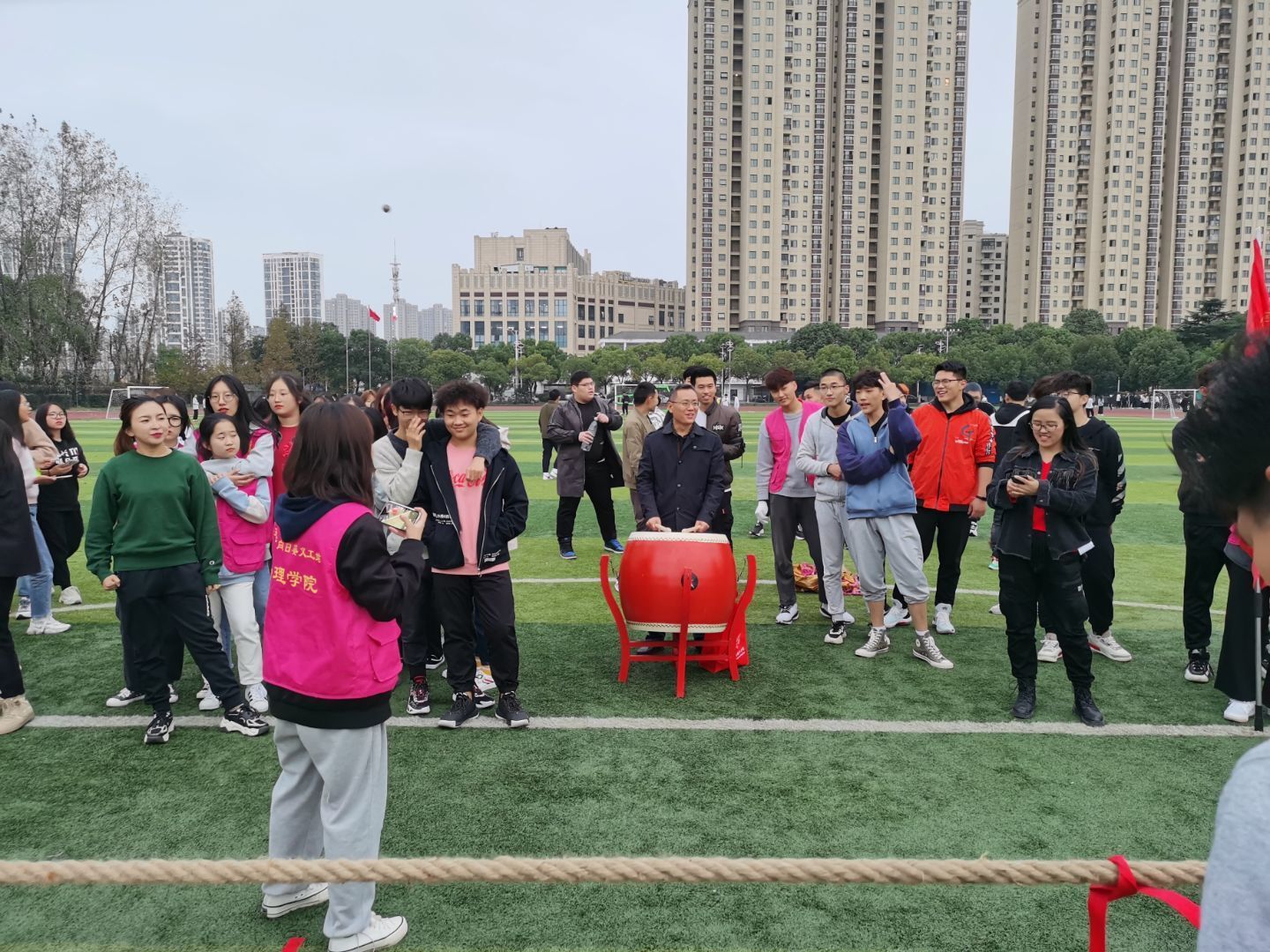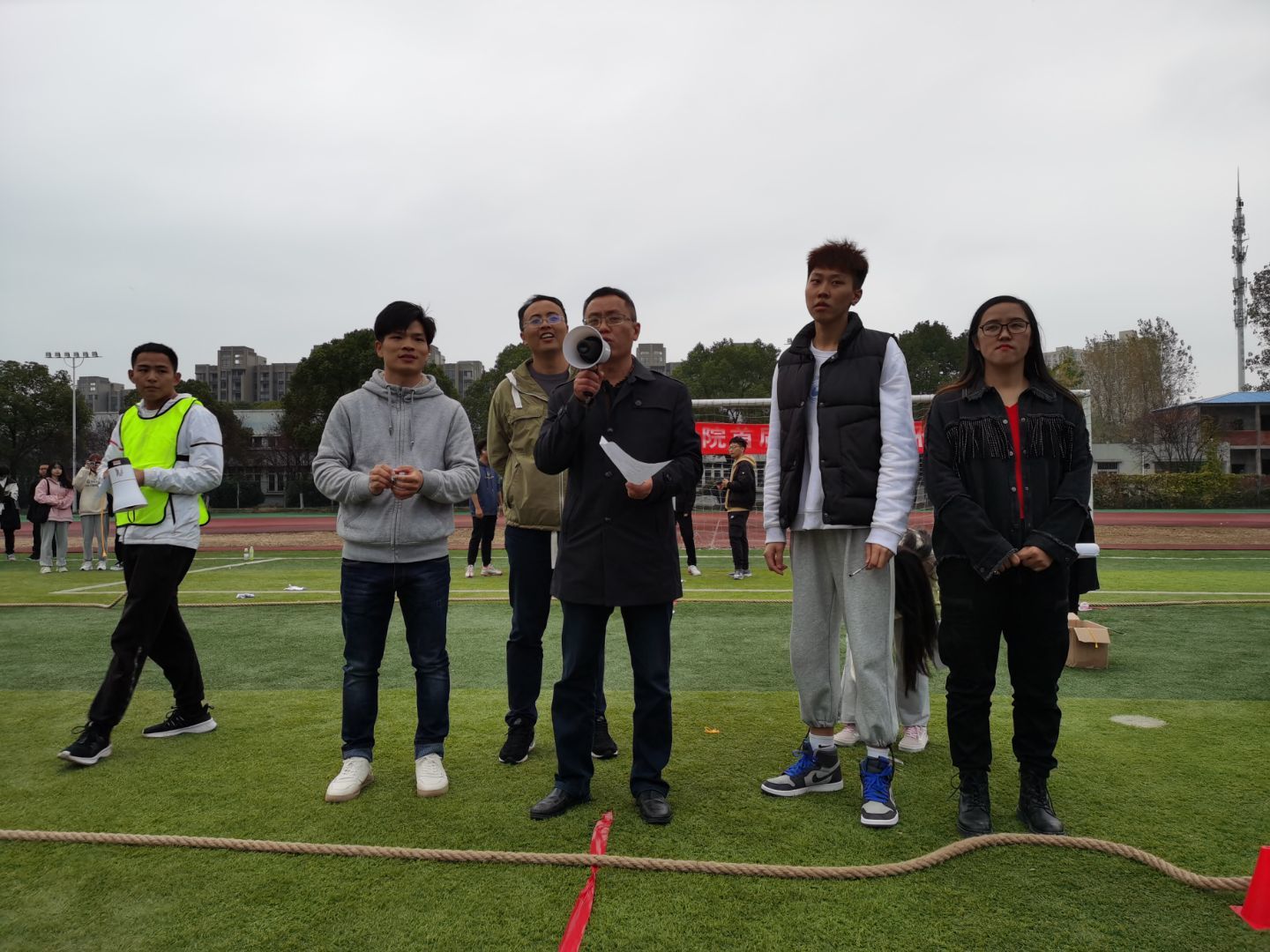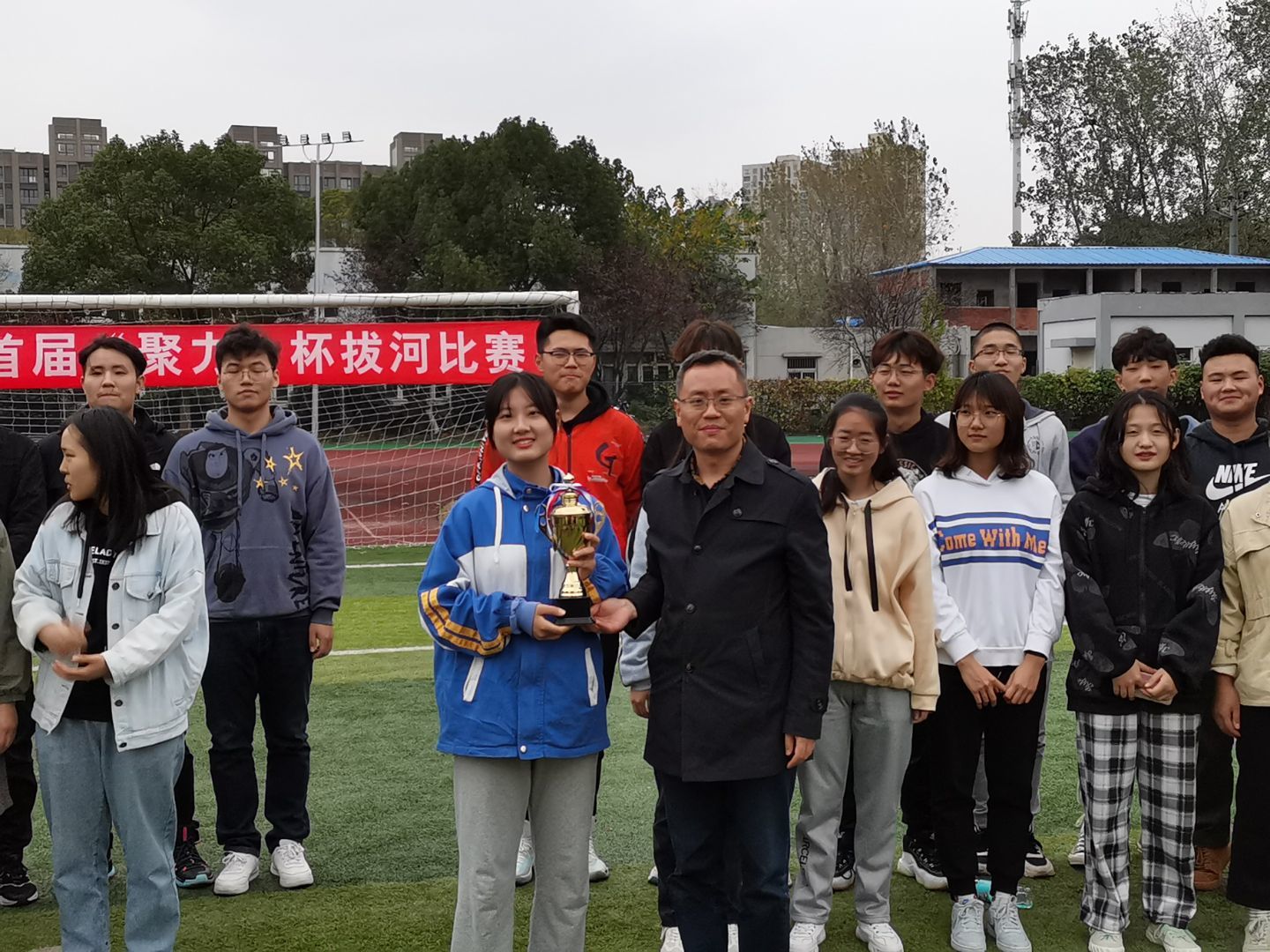 为了丰富学生的课余文化生活,增进学生之间的交流,培养学生的团队协作能力,11月20日管理学院在学校操场举办了第一届“聚力杯”拔河比赛。参赛队伍以班级为组别,共有21队。管理学院党总支书记苗勇和学工办朱琳、程镭鳕、刘世强、刘婷婷、晁帅老师一起来到现场为同学们加油助威。