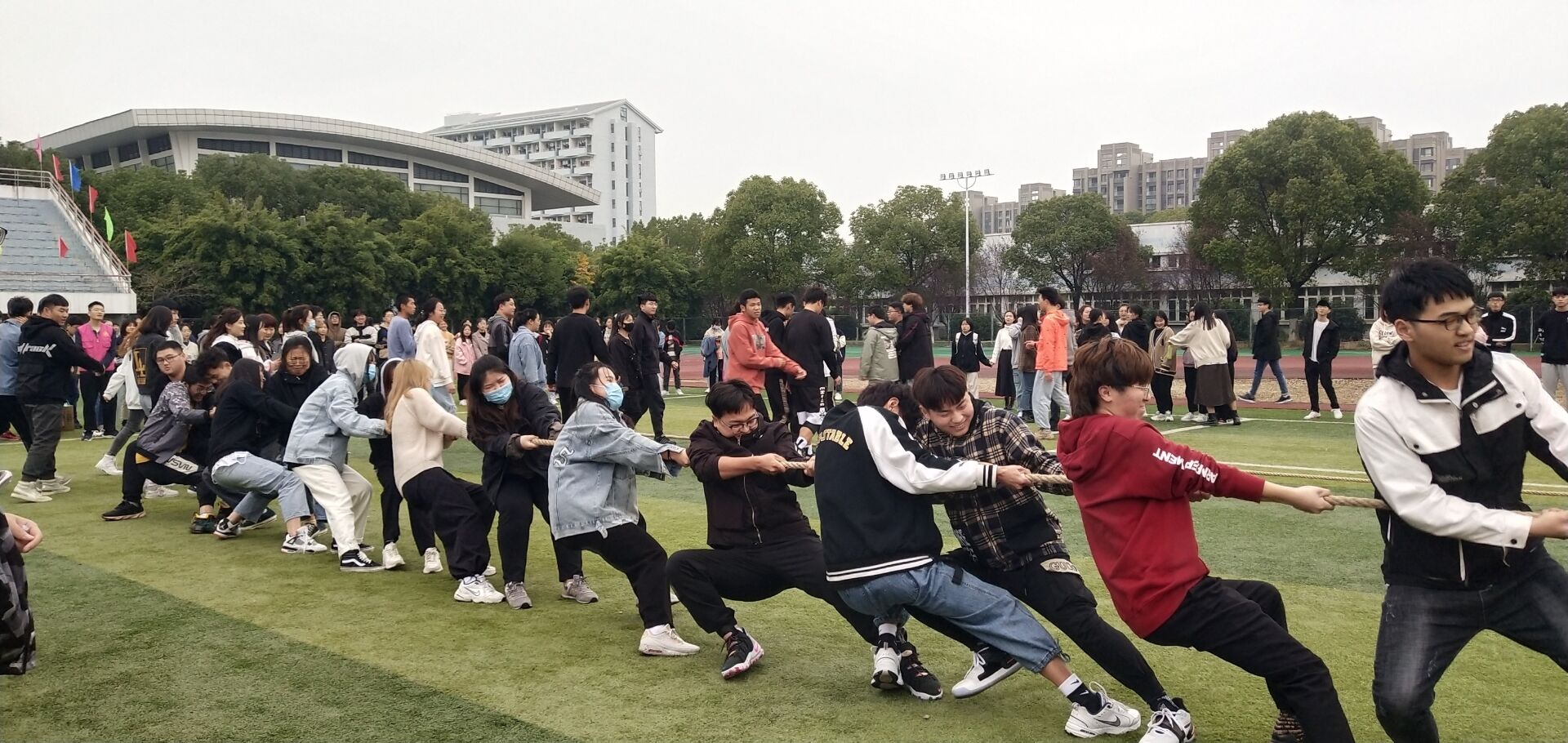 本次比赛共为四轮,分为A、B两组进行,各组两两PK采取晋级方式产生本次拔河比赛的冠军队伍。当比赛的哨声响起,队员们使出浑身力气把绳子向后拉,绳子中间的红线左右摇摆。两边队员都竭尽全力,老师们也站在队伍旁边助阵加油,观赛的同学们主动组成了拉拉队,竭力大喊“加油,加油!”,呐喊声、擂鼓声,此起彼伏,飘荡在整个操场上。