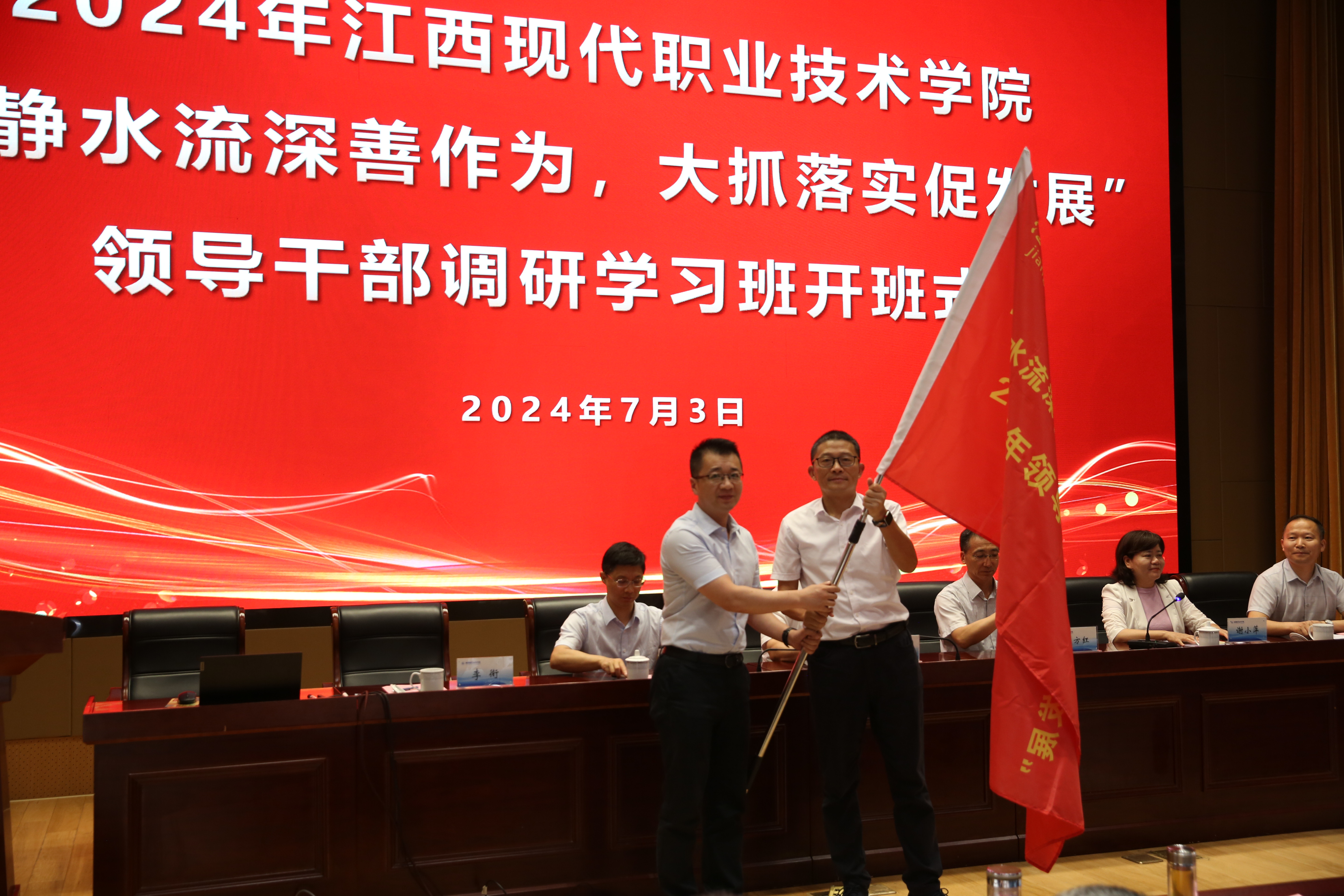 无锡职业技术学院党委委员兼纪委书记李衔为江西现代职业技术学院党委(院长)办公室主任、培训班班长江长华授旗,并邀请江西现代职业技术学院各位领导在班旗上签名。