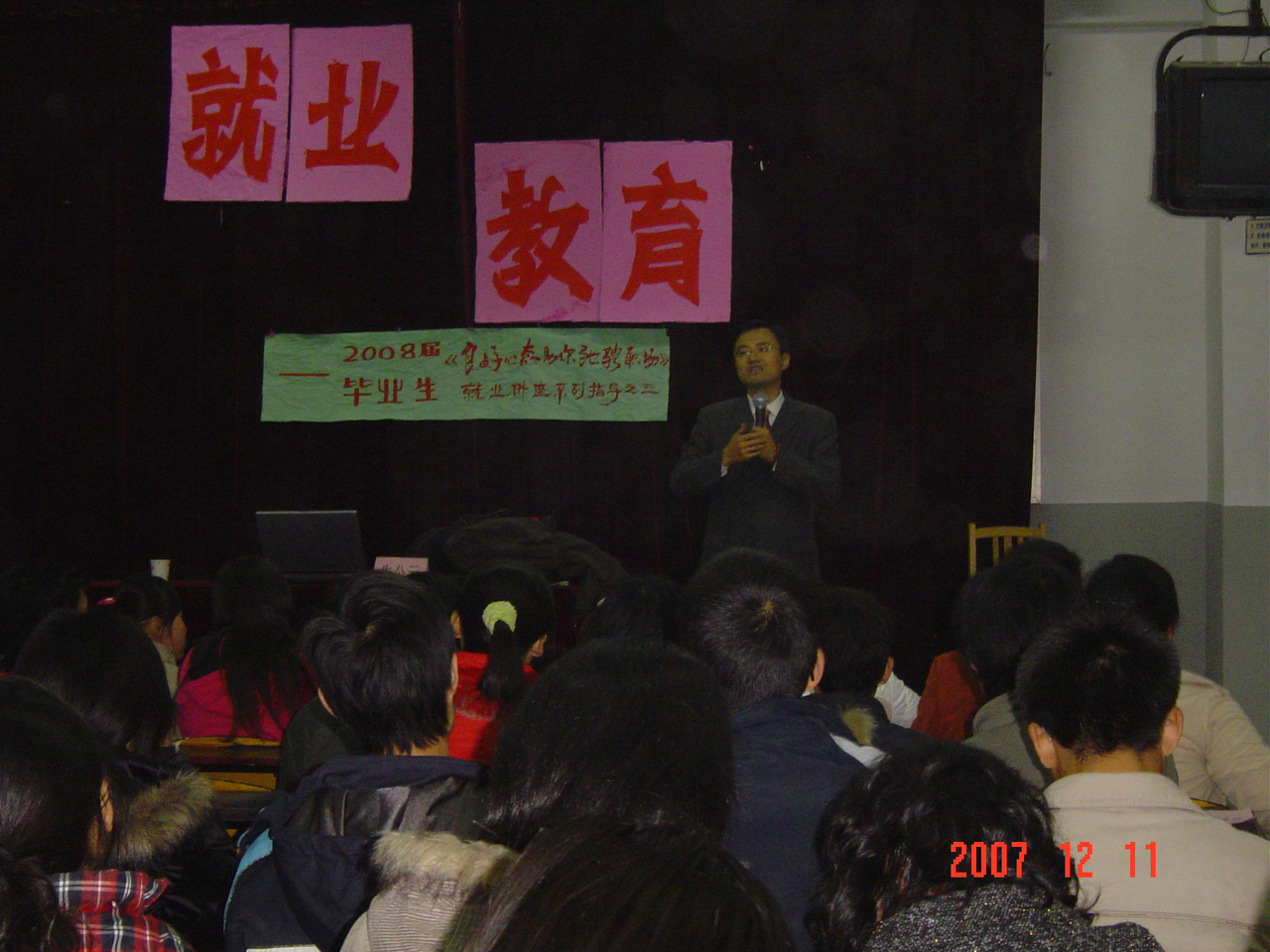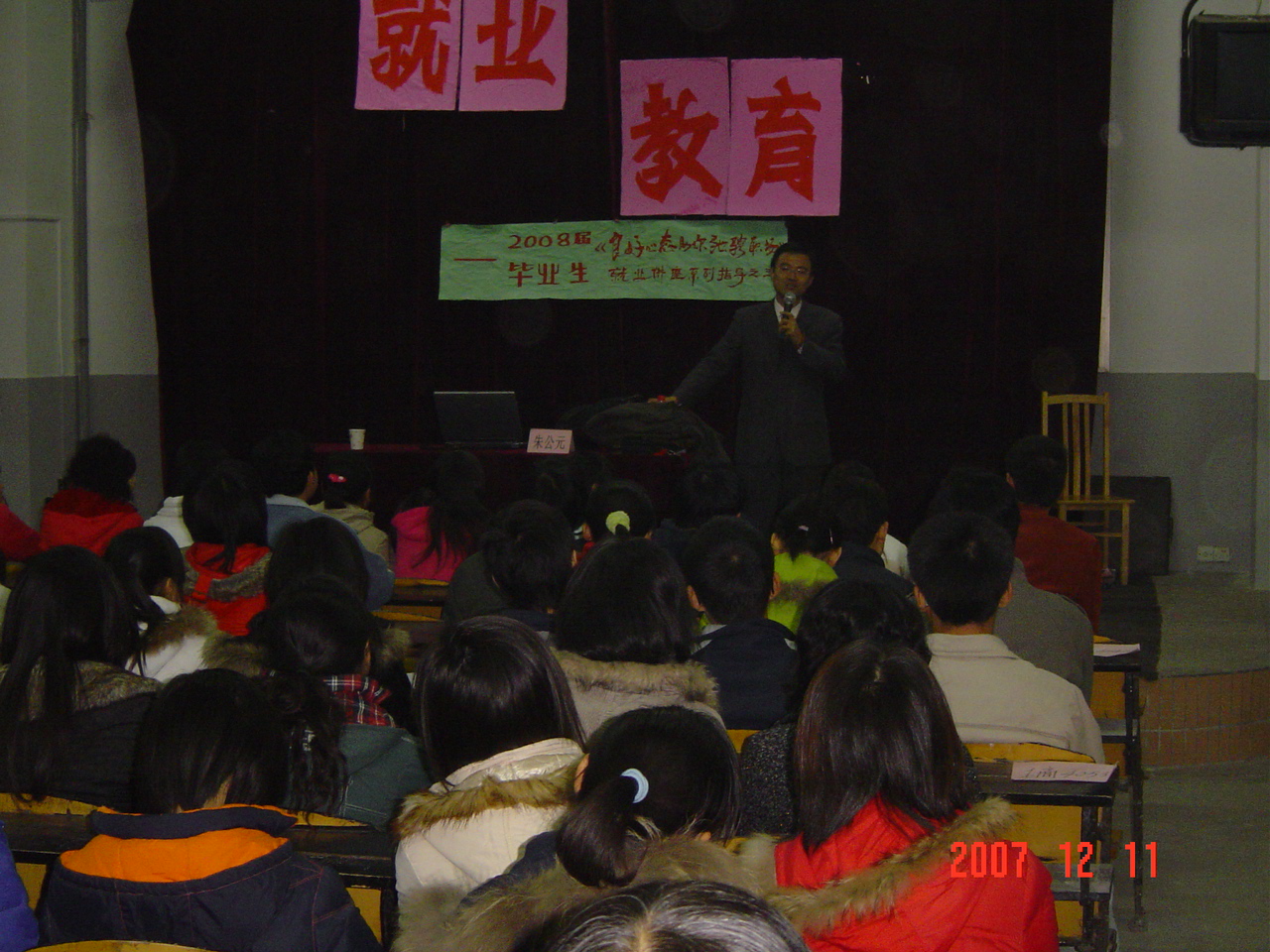 参加听讲的学生有2008届毕业生,还有06、07级的同学共300余人。大家济济一堂,认真听讲,秩序井然。精彩生动的2个多小时的互动演讲,不断赢得了同学们一阵阵掌声,一部分同学还做了较为详细的记录。朱老师的演讲,以就业过程中所遇到的种种心态,作了详细而富有哲理的剖析,并结合当前就业形势,对学生的要求,以生动的案例作了一一诠释。朱老师风趣、幽默在演讲中表现出睿智,使听讲的学生矛塞顿开,受益匪浅。