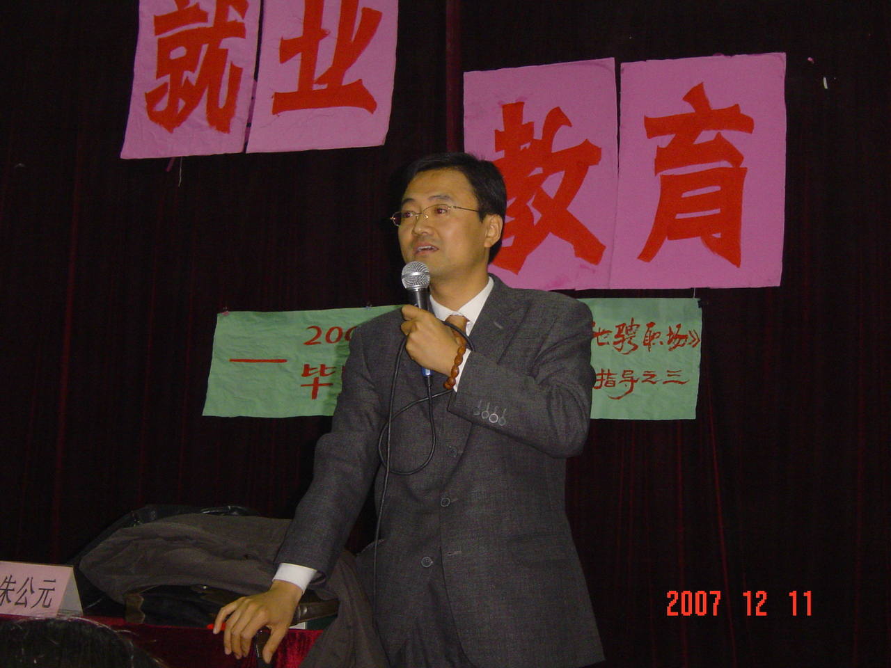 12月11日下午3 :00 ,中桥校区邀请无锡市劳动局SYB创业指导老师朱公元先生给2008届毕业生进行了就业指导系列讲座。主讲的题目是:良好心态,助你驰骋职场。这次讲座由院学生处就业办邝乐老师主持。
