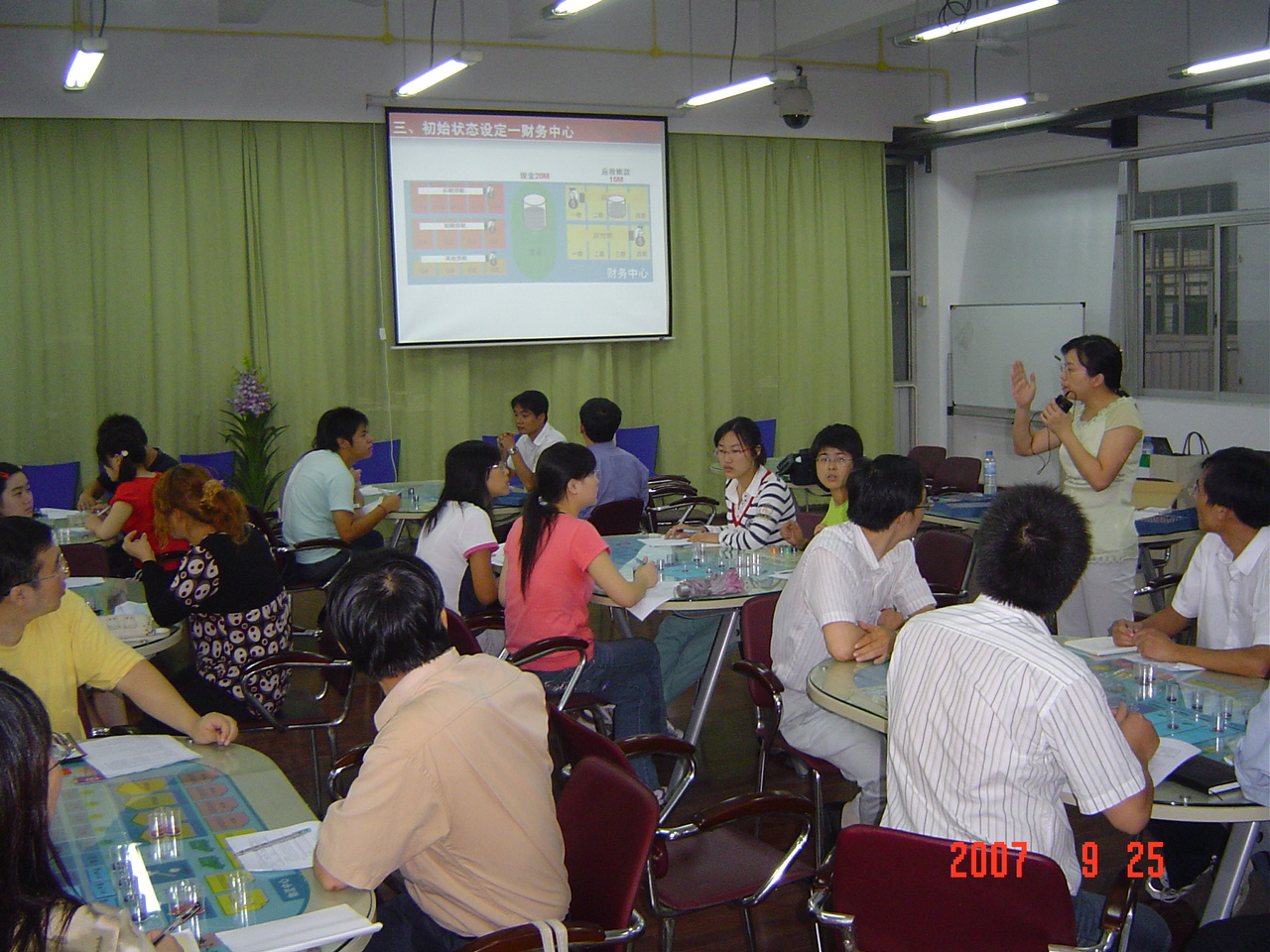 9月25日下午,工商管理系部分老师与学生在ERP实训室参加由用友无锡分公司王经理主讲的ERP沙盘模拟对抗。王经理的讲课图文翔实,条例清晰,以赛事为例,使师生得到了一次实战演练,得益匪浅。图为ERP沙盘模拟对抗赛现场场景。