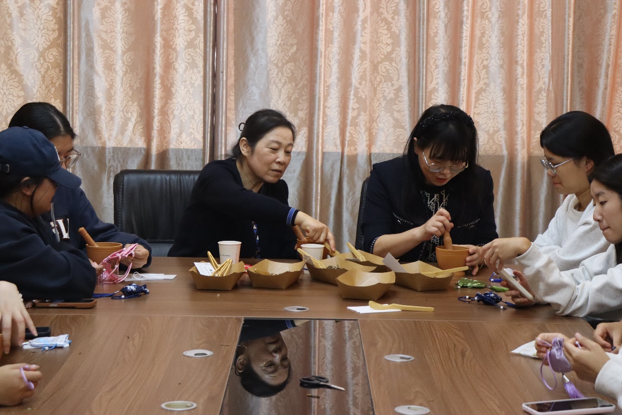 活动现场,于云波、赵萍老师带着精心准备的艾叶、藿香、佩兰等中药材,耐心讲解香囊的药用价值与民俗寓意。“端午佩香囊避瘟邪,重阳制香袋寄安康,这是老祖宗传下的智慧。”于云波老师一边示范配料比例,一边结合自身从教经历叮嘱同学们:“做事如配药,既要精准用心,也要懂得取舍包容。”赵萍老师则手把手指导学子缝制香囊,从穿针引线到香料搭配,细致入微的教导里满含对青年一代的疼爱。